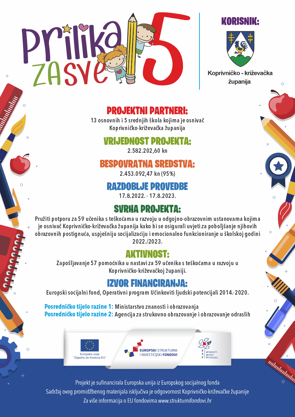 Partneri: VP –Koprivničko-križevačka županija, 13 osnovnih i 5 srednjih škola kojima je KKŽ osnivač